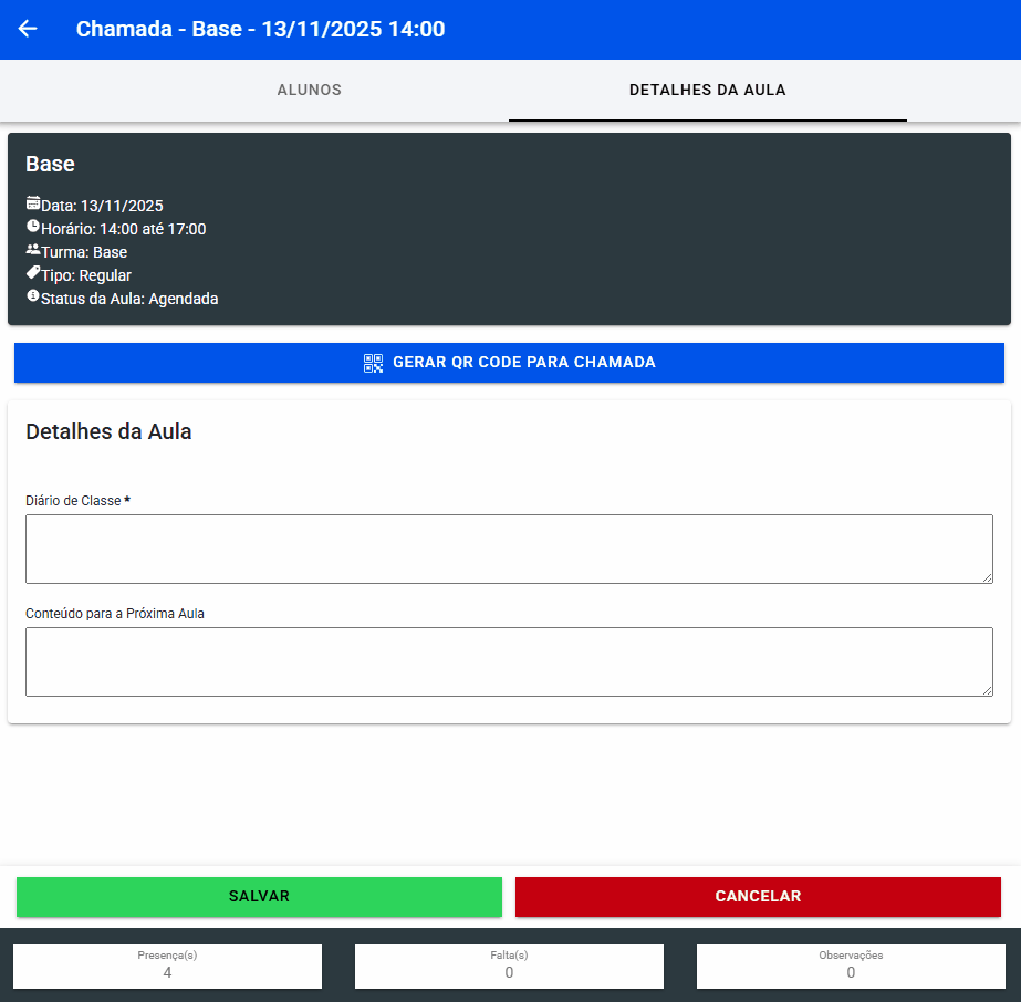 ✔ A aba de Detalhes é usada para se informar os campos de “Diário de Aula“, e “Conteúdo da Próxima Aula“. Também serão inclusos quaisquer campos personalizados registrados para Questionários do modelo “Chamada (Aula)“. Nota-se que o Diário de Aula é de preenchimento obrigatório para se realizar a chamada.