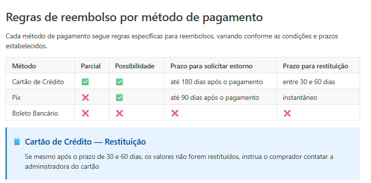 O reembolso pode ser feitos em, no máximo, até 180 dias após o pagamento, e podem demorar até 2 meses para aparecer na fatura do cartão do cliente. Esse é o funcionamento padrão da Visa, Mastercard etc.