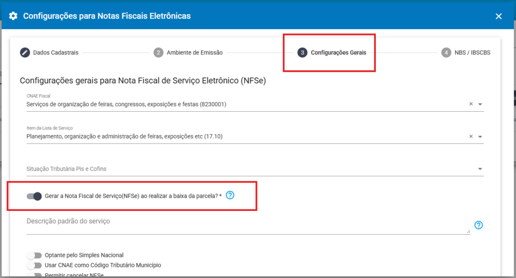 ✔ Para habilitar a emissão de nota fiscal de serviço automática na baixa de um parcela: