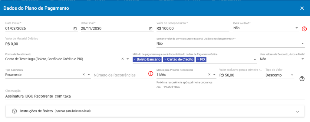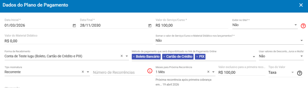 – Recorrente: Define que serão feitas cobranças mensais para o aluno. É possível configurar um número de meses em que será feita a recorrência, ou então deixar o campo vazio para que a recorrência seja feita por tempo indefinido.