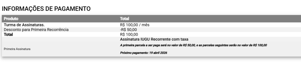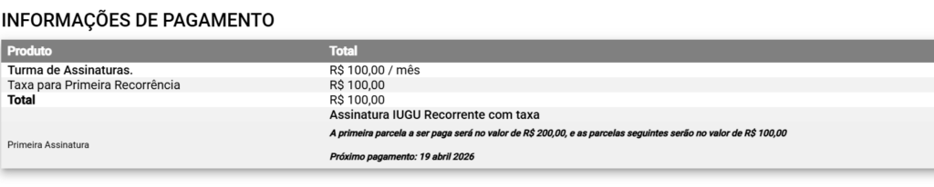 ✔ Esta opção define a quantidade de meses para a próxima recorrência da Assinatura(nova cobrança), após a realização da matricula e pagamento da primeira parcela/cobrança da recorrência.