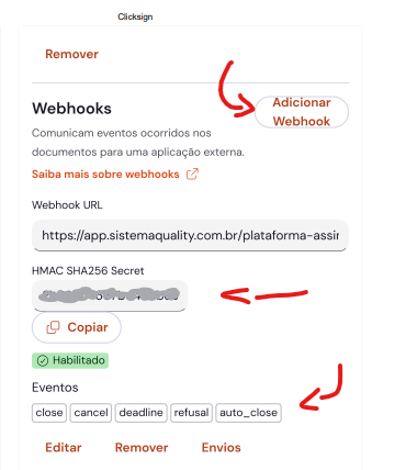 Esse HMAC SHA256 Secret precisa ser repassado para o Sistema Quality para que o sistema identifique e trabalhe com os eventos cadastrados.