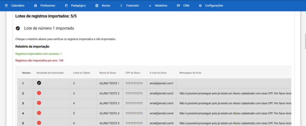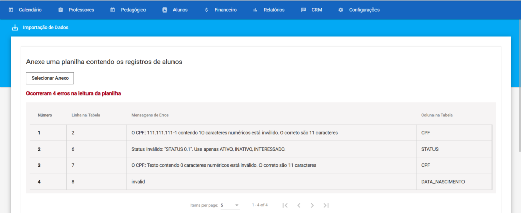 - Caso ocorra erros na importação, como na imagem acima, ajuste os dados que estão incorretos e reenvie a planilha apenas com os registros corrigidos.