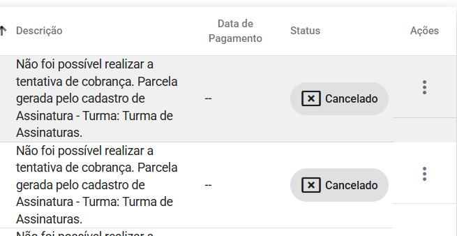 ✔️ Por padrão quando ocorre a tentativa de cobranças em cartão o sistema sempre registra uma parcela, se ocorrer alguma erro ou recusa pela adquirente do cartão, no momento da realização da cobrança,  essa parcela será colocada como cancelada no sistema, para mantermos o histórico das tentativas de cobranças. Sempre é registrado uma parcela para cada tentativa que o aluno realizar: