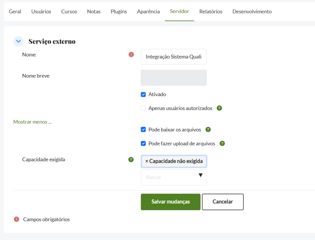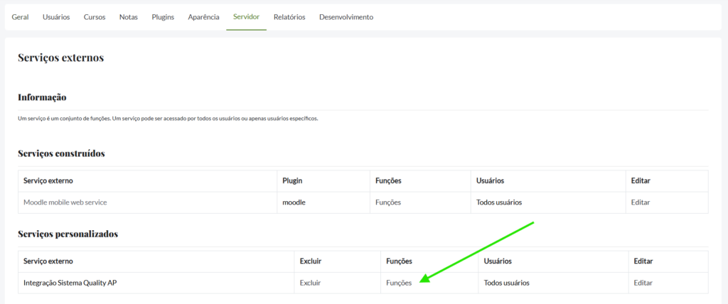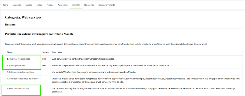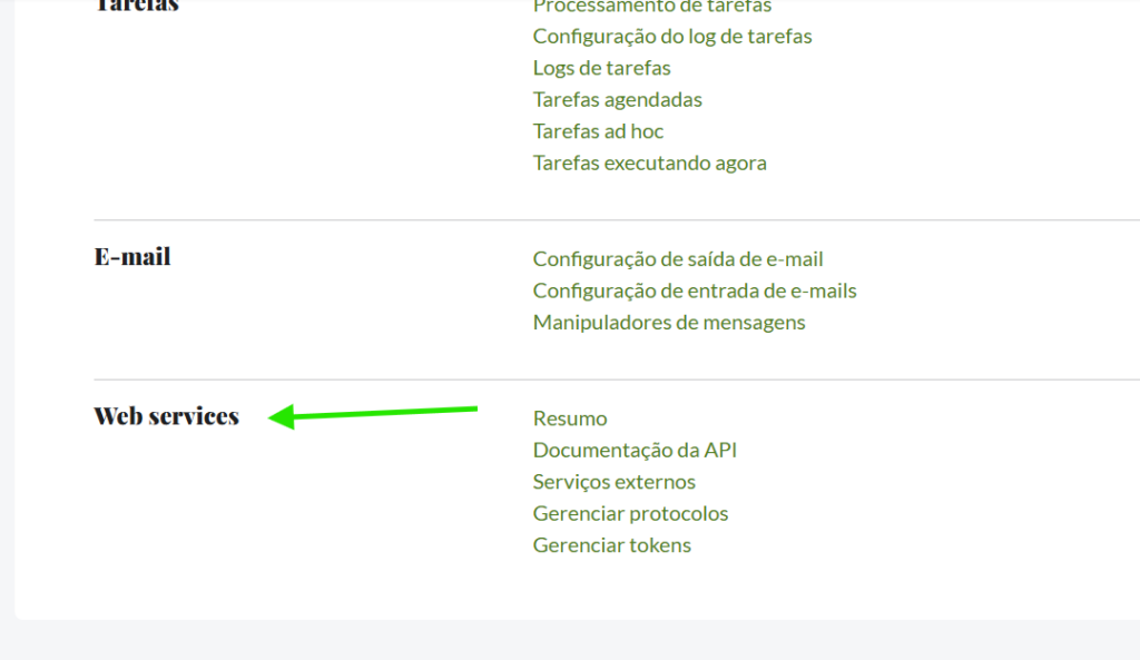 - Em sua plataforma Moodle, acesse o menu Administração do Site > Aba Servidor > Ao final da página, clique em Web Service.