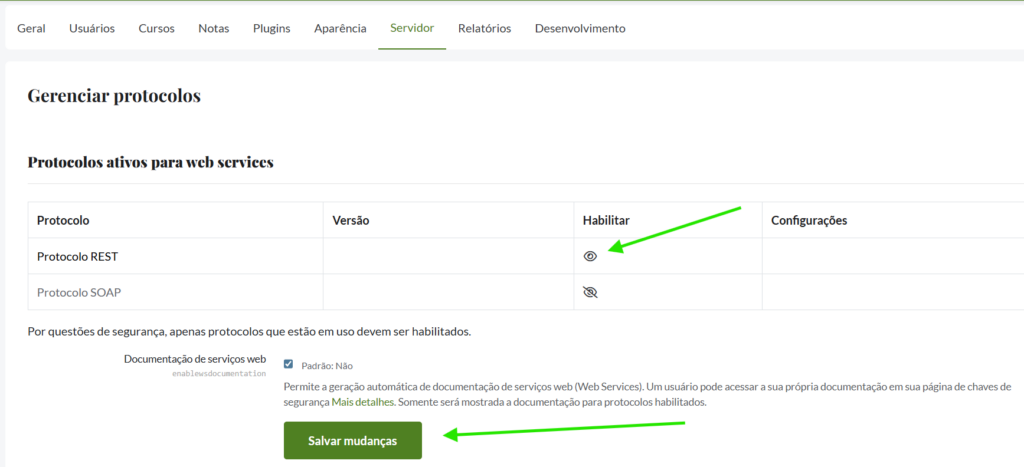 - Clique em Habilitar Web Services, marque a opção Habilitar serviços web (web services) e clique em Salvar Mudanças.