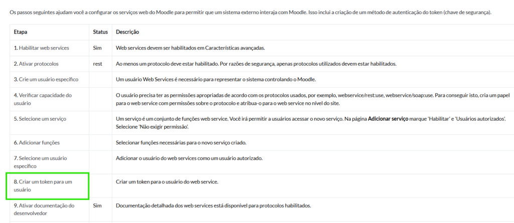 - Com o serviço devidamente configurado, agora, vamos gerar o token de acesso. Retorne as etapas de configuração do serviço e acesse 8. Criar um token para um usuário.