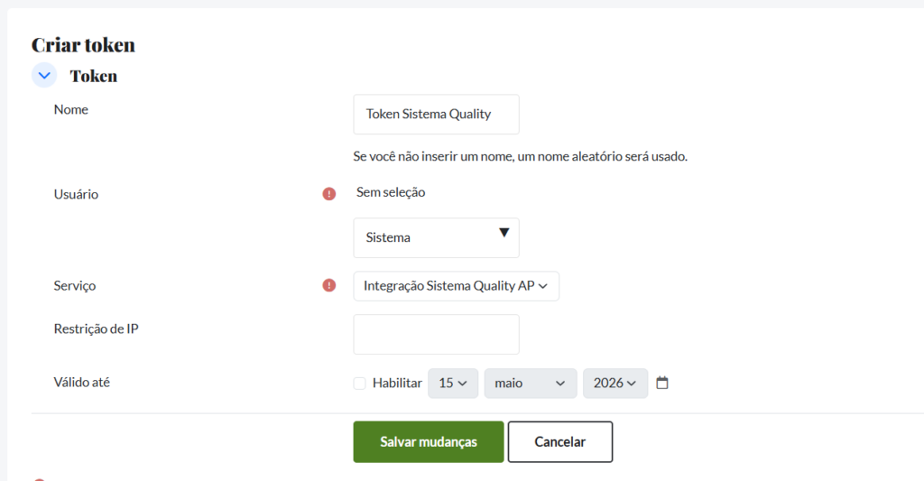 - Clicando em Salvar Mudanças, será gerado um token de acesso, copie o token , acesse o Sistema Quality no menu Configurações > Credenciais de Acesso > Adicione um registro do tipo Moodle e preencha os campos obrigatórios: